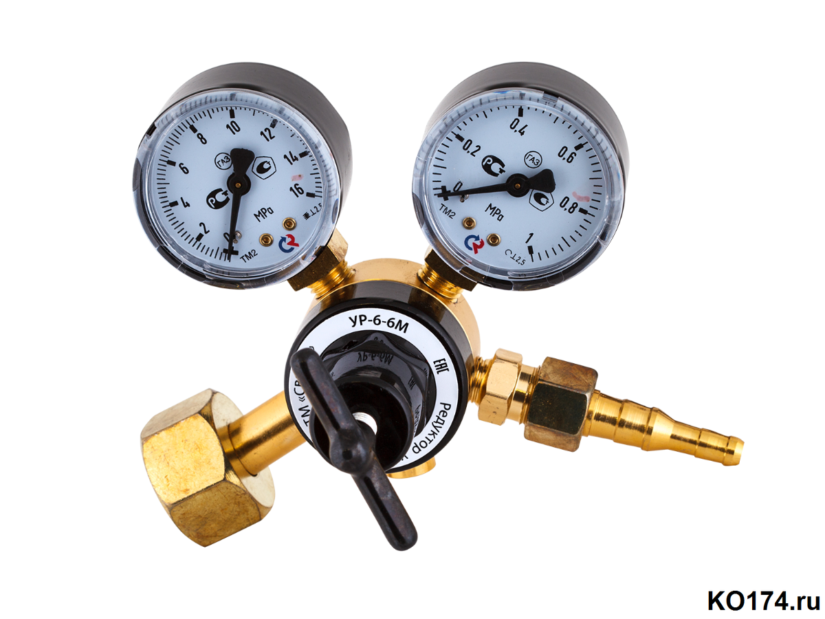 Редуктор углекислотный УР-6-6М (малогабаритный) предназначен для понижения и регулирования давления газа (углекислый газ CO2), поступающего из баллона, и автоматического поддержания постоянного рабочего давления газа при питании постов и установок газовой сварки, резки, пайки и других технологических процессов. Соединяется при помощи газовых рукавов.